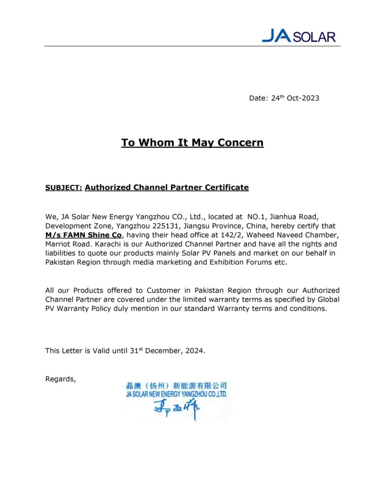JA Solar Authorized Channel Partner Certificate